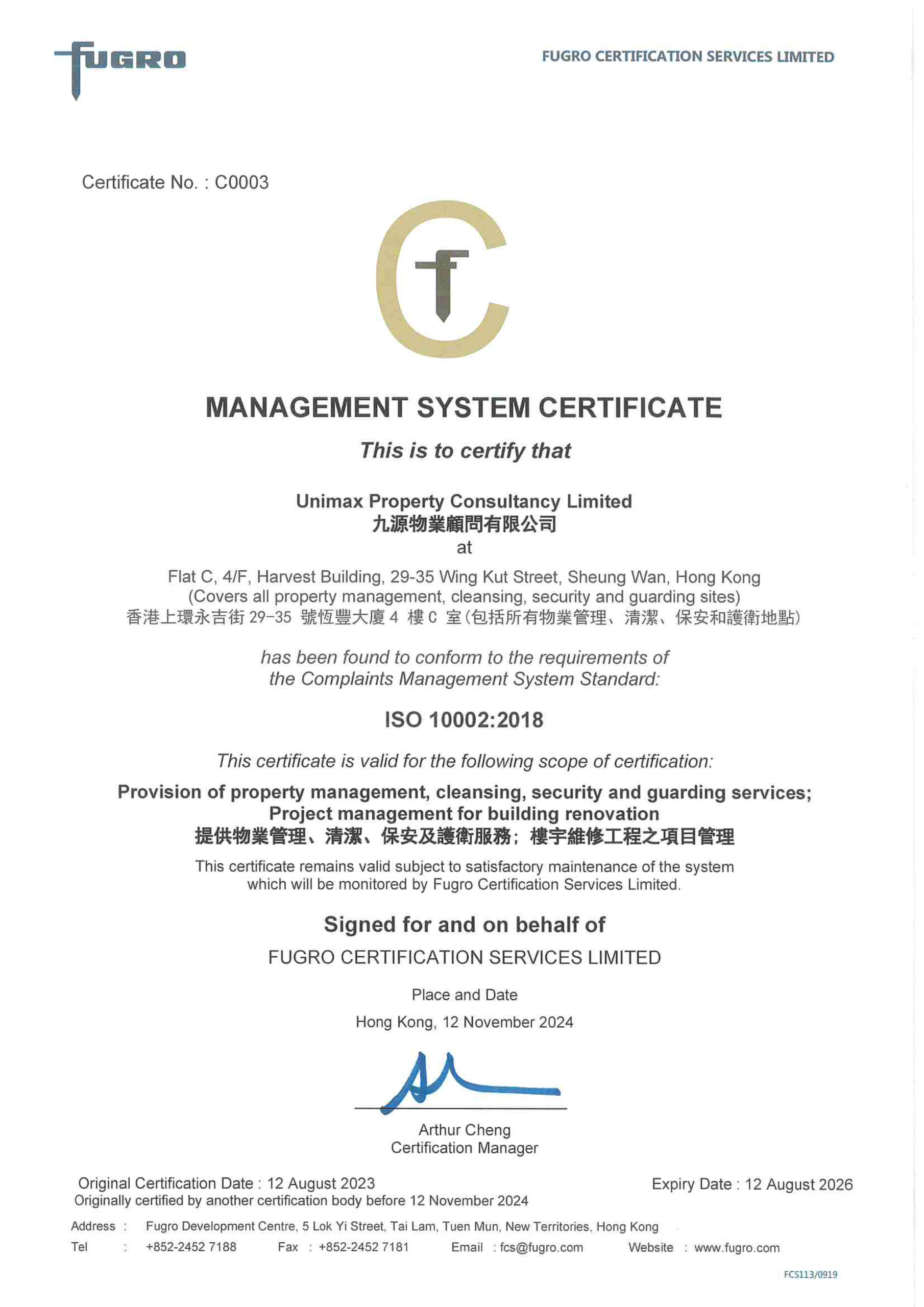 房屋委員會最佳物業服務公司(物業管理合約)獎 獲得以下認證: ISO 9001 (品質管理) ISO