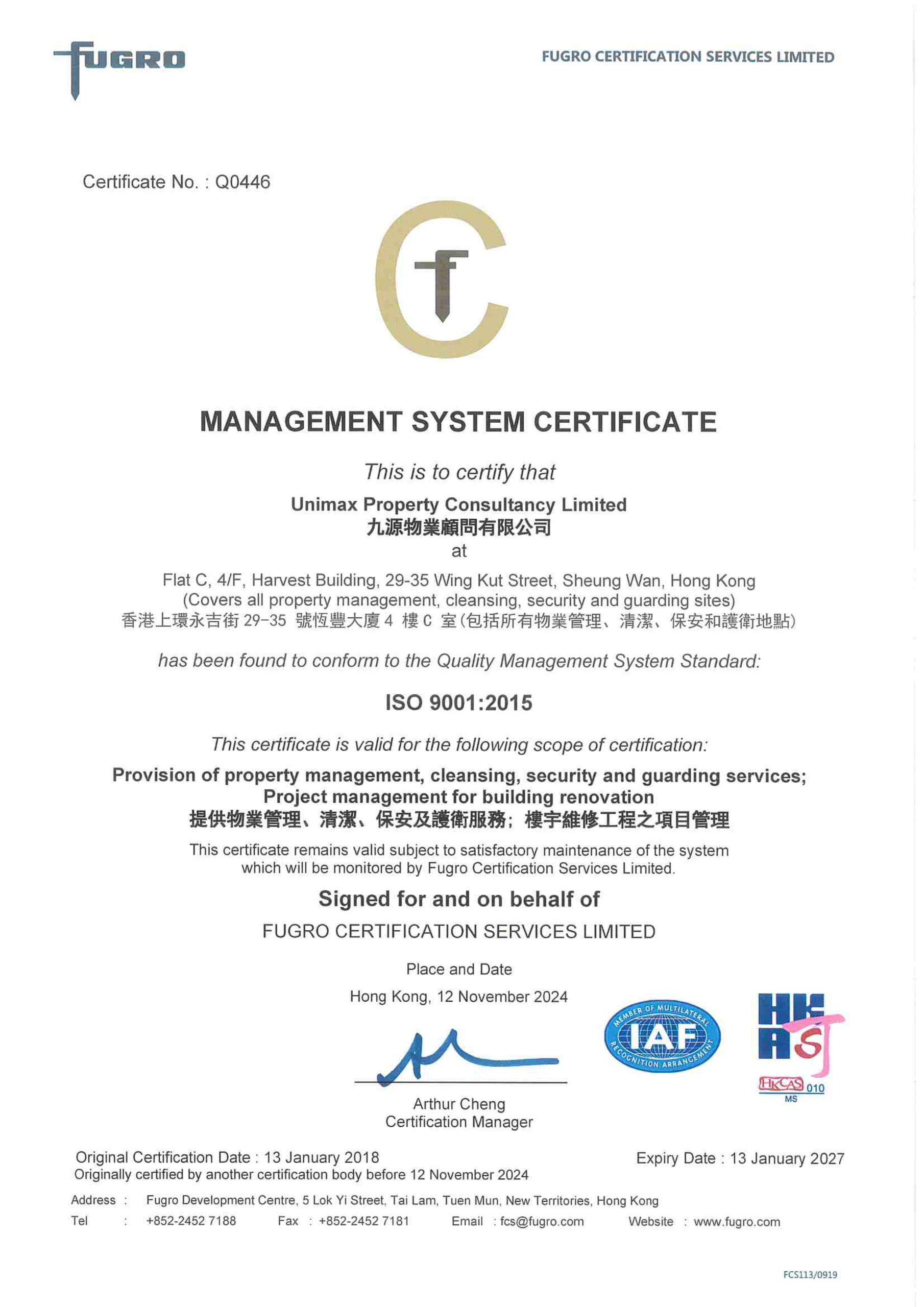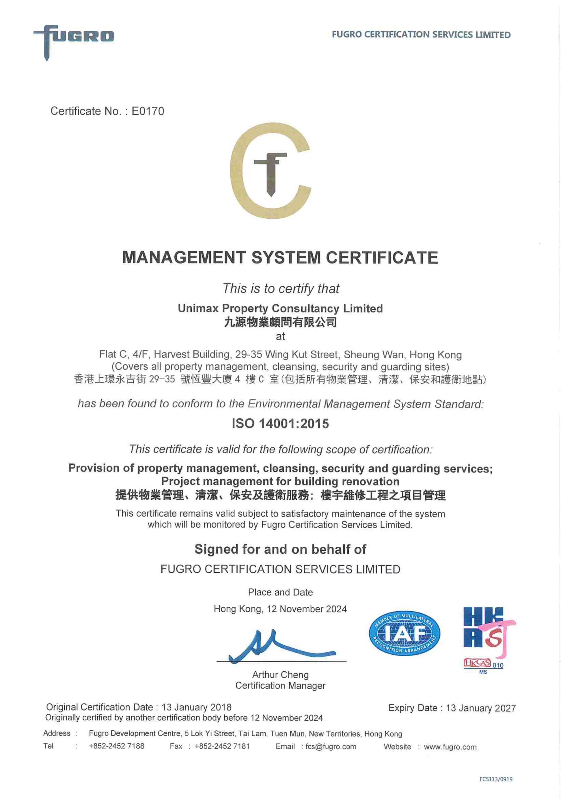 升級至房委會保安服務承辦商(Band IIA)名單 ISO 14001 認證 OHSAS 18001