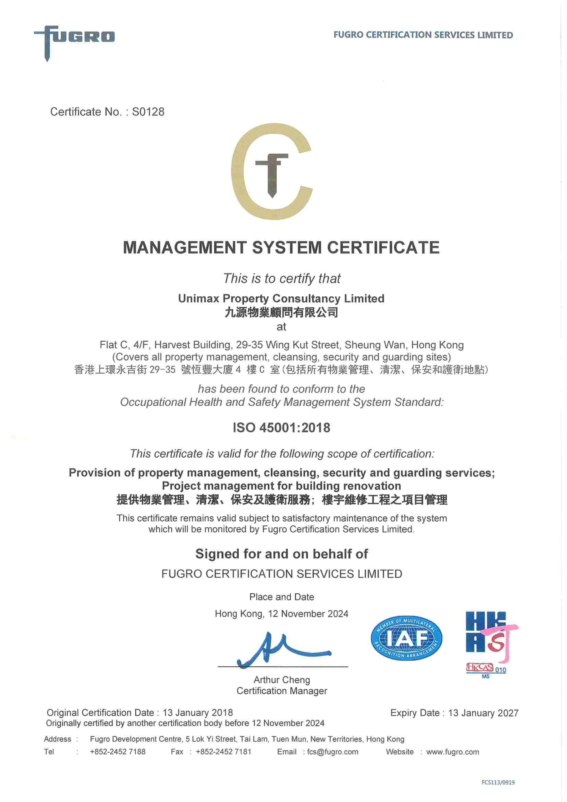 列入房委會承辦商名單 獲得以下認證: ISO 45001 (職業健康與安全管理)
